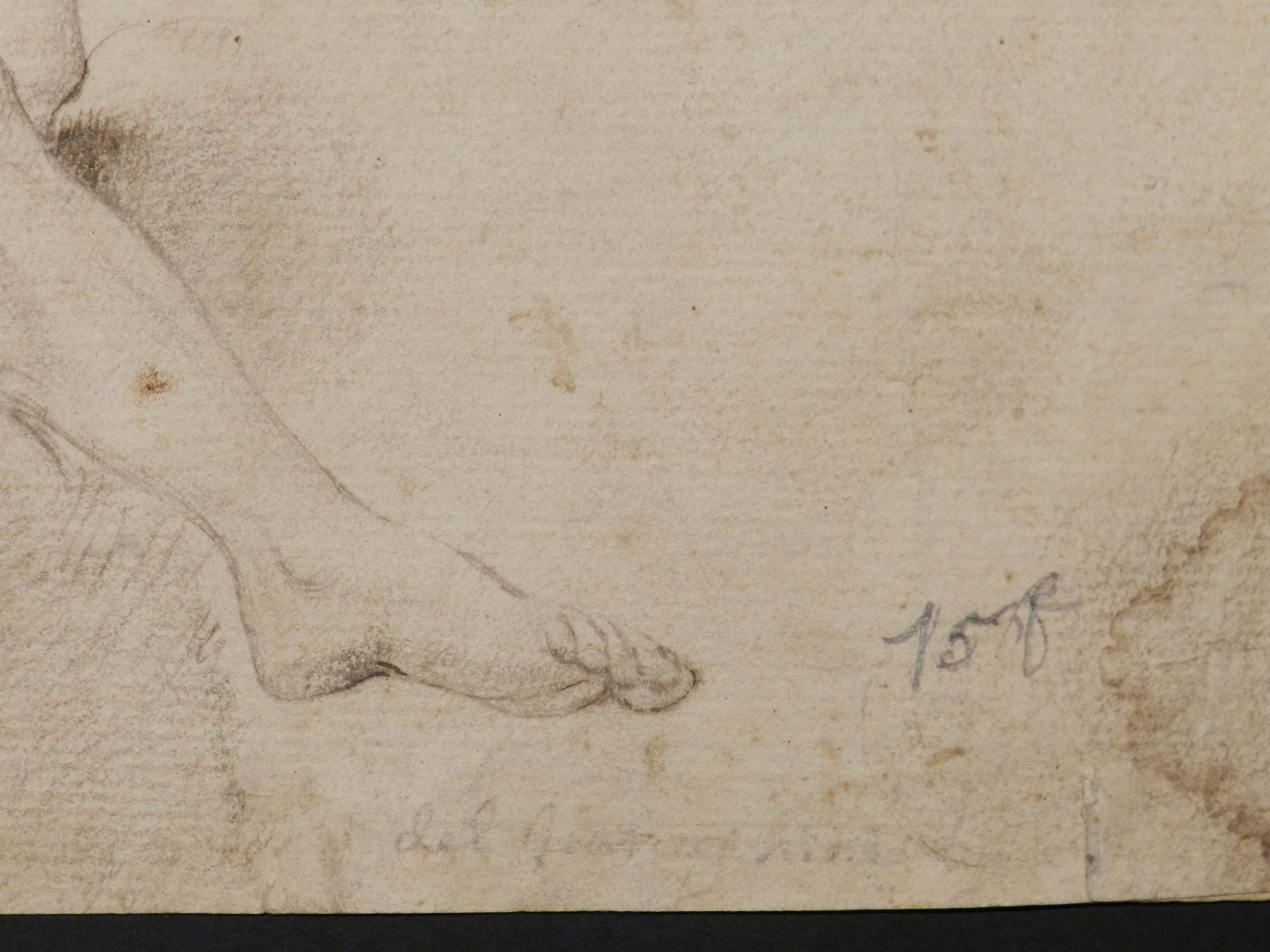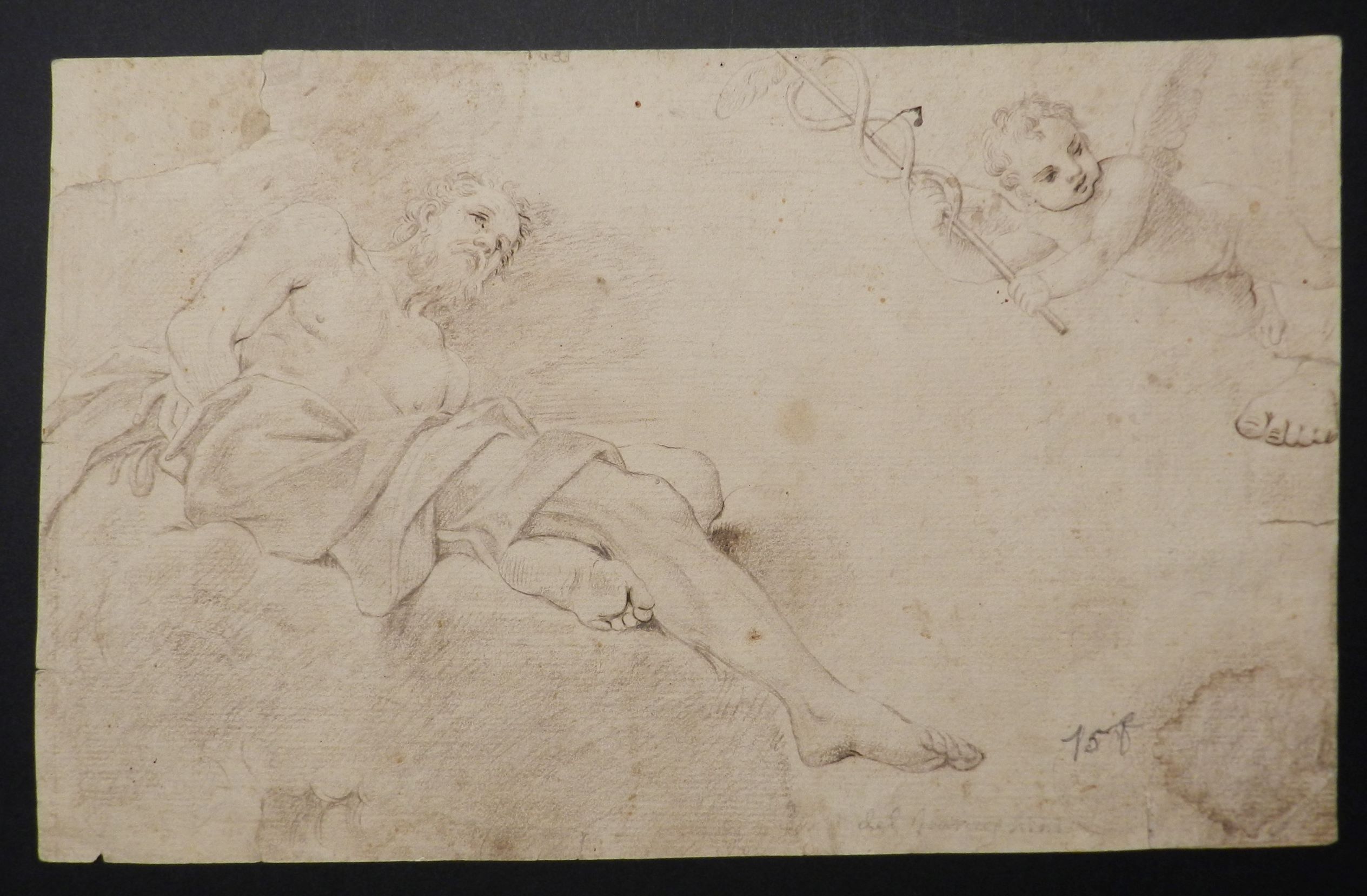 Inscrito, recto: a lápiz negro con letra de los siglos XIX-XX, bajo el pie de Saturno: “del Franceschini”; abajo, hacia la derecha : “15 (?)”.