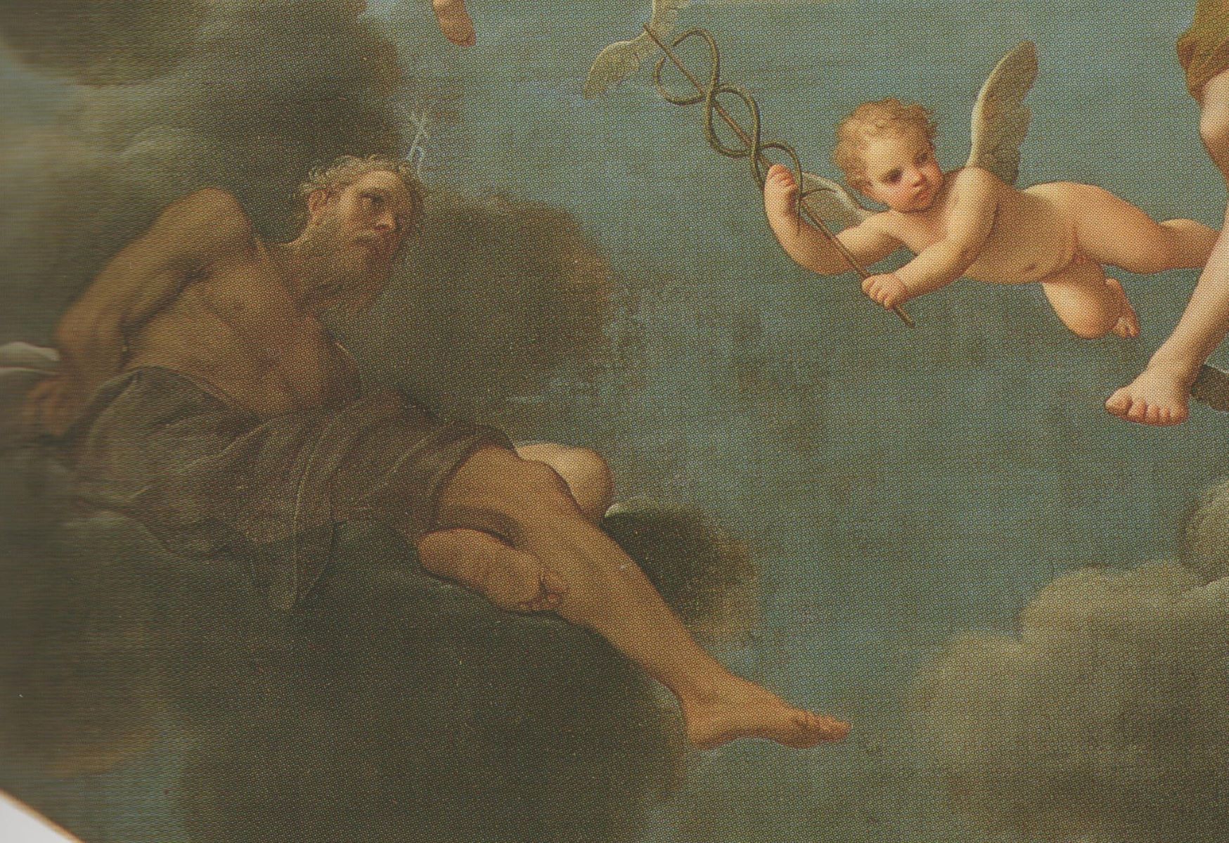 El dibujo (9) muestra la escena que forma parte del asunto Júpiter y Mercurio con Saturno maniatado (7). En efecto, Saturno aparece sentado sobre una nube con sus manos atadas tras su espalda (10), situado junto al ángel que porta la vara con dos culebras o caduceo (11), uno de los atributos principales del dios Mercurio, destacado personaje de la composición definitiva quien acompaña a Júpiter. El diseño muestra dos elementos compositivos más, un pie junto al citado ángel que corresponde a Mercurio, y algunos dedos de otro pie situados sobre la cabeza de Saturno (12), los del pie izquierdo de uno de los tres ángeles que rodean otra nube, pormenor del ángulo superior izquierdo de la pintura mural. Este pensamiento que aquí nos ocupa es un estudio en detalle de Saturno, único conservado hasta el momento, pues su compartimentación respecto del asunto general demuestra que Franceschini debió de plantear los personajes representados (Júpiter, Mercurio, Saturno, por un lado, y Marte, Venus y Diana, por otro) como asuntos individualizados, siendo este dibujo, muestra de ello.