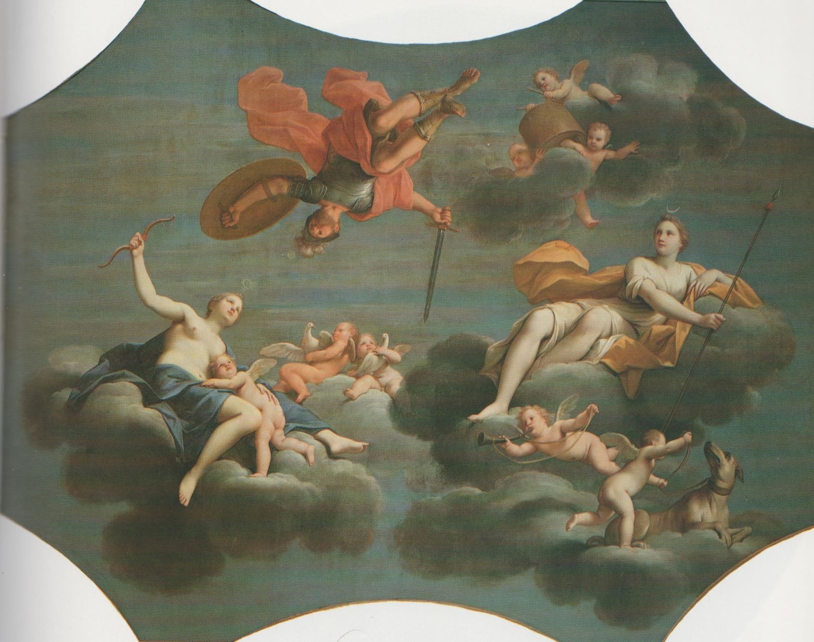 Franceschini realizará un bello conjunto formado por tres decoraciones al fresco en la mencionada Galería del Jardín, con los siguientes asuntos: Apolo y Juno en los cielos en compañía de Ceres, Flora y Baco junto a las personificaciones de la Lluvia y el Rocío (4), como motivo central; Júpiter y Mercurio con Saturno maniatado (5, 6, 7), a su izquierda; y Marte con Venus y Cupido en presencia de Diana (8), a su derecha.