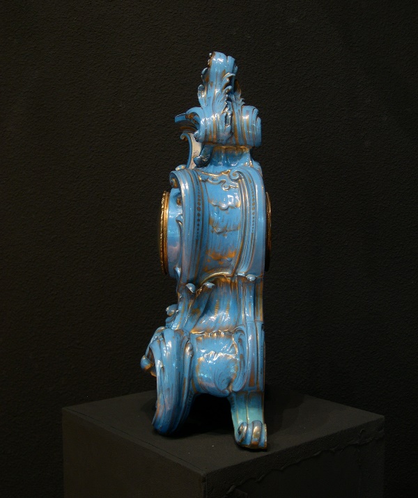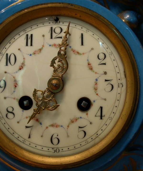 Reloj de estilo Luis XV. Caja realizada en porcelana azul con decoración de ángeles niños portando motivos florales. Pintura firmada por C. Velly. Obra realizada por el maestro relojero Louis Boname para la Exposición Universal de París de 1900. Máquina firmada "HORS CONCOURS / L.s BONAME / SELENCOURT... / FRANCE / EXon Uelle 1900".